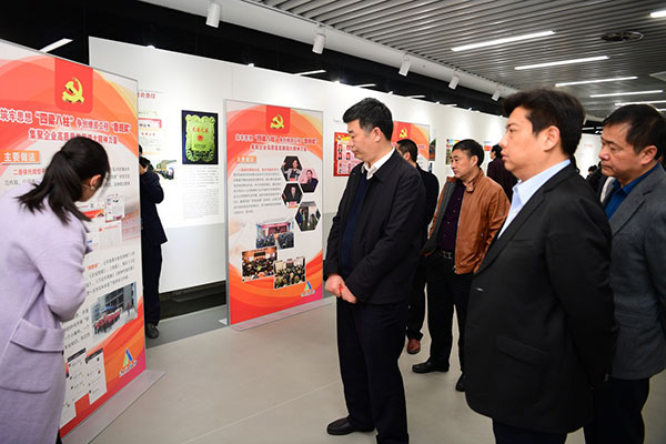 在達欣集團企業(yè)展示中心,嚴長江一行參觀了“筑牢思想‘四梁八柱’ 爭創(chuàng)燎原工程‘魯班獎’”主題展板,詳細了解了企業(yè)黨員冬訓工作開展情況,對黨建工作的創(chuàng)新做法給予了肯定。集團董事長、黨委副書記馬和軍陪同參觀。