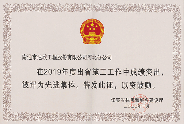 日前,從江蘇省住房和城鄉(xiāng)建設(shè)廳駐天津辦事處傳來(lái)捷報(bào),我司第四、六工程公司被評(píng)為“2019年度江蘇出省施工先進(jìn)集體”,第四、六黨支部被評(píng)為“2019年度江蘇進(jìn)津冀施工優(yōu)秀黨組織”,陳仁富、楊靜、徐仁忠同志被評(píng)為“2019年度江蘇進(jìn)津冀施工先進(jìn)企業(yè)經(jīng)理”,謝廣財(cái)同志被評(píng)為“2019年度江蘇進(jìn)津冀施工優(yōu)秀黨務(wù)工作者”,楊靜、傅海榮、陳正進(jìn)同志被評(píng)為“2019年度江蘇進(jìn)津冀施工優(yōu)秀共產(chǎn)黨員”,崔恒俊、謝存宏、曹為華、游慶兵、周小兵同志被評(píng)為“2019年度江蘇進(jìn)津冀施工優(yōu)秀建造師”,徐培華、謝兆波、束長(zhǎng)春、周興穩(wěn)同志被評(píng)為“2019年度江蘇出省建筑施工先進(jìn)個(gè)人”。