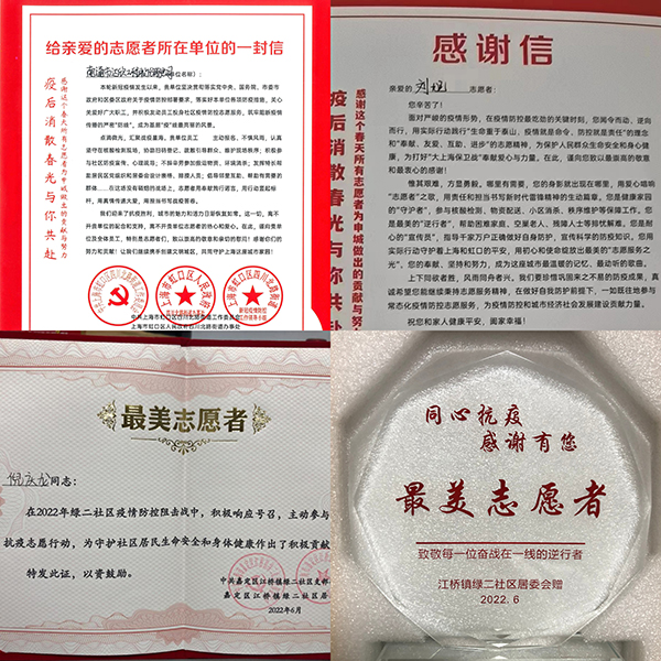 近日,公司陸續(xù)收到來自中共上海市虹口區(qū)四川北路街道工作委員會、街道辦事處、新冠疫情防控工作領導小組對集團第一工程公司廣大職工、第八工程公司劉旭,以及中共嘉定區(qū)江橋鎮(zhèn)綠二社區(qū)對第八工程公司倪慶龍,在上海疫情期間,積極投身社區(qū)疫情防控志愿服務,不懼風雨、不辭辛苦,始終堅守助力打贏上海疫情阻擊戰(zhàn)的基層戰(zhàn)場,所展現(xiàn)出的大愛、擔當、奉獻精神,表示感謝和慰問。倪慶龍獲得“最美志愿者”稱號。
