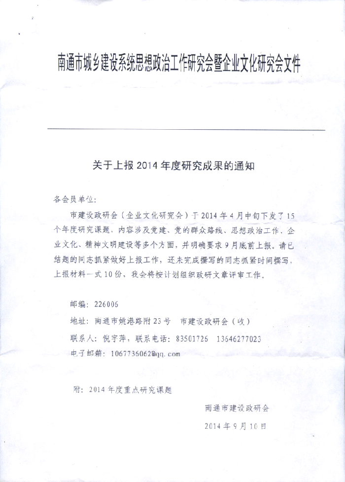 關(guān)于上報(bào)2014年度研究成果的通知